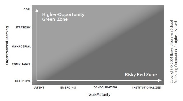 Les présentations étant faites, nous pouvons nous pencher sur le « Civil-Learning Tool ». Cet outil se base sur les deux précédemment cités, et est toujours tiré du même article. On peut le voir ci-dessus sous la forme d’un graphique. Sur l’axe vertical (c’est l’ordonnée ou l’abscisse, je ne suis plus très sûr…), on peut voir les 5 étapes de la responsabilité sociale. Sur l’axe horizontal (c’est l’abscisse ou l’ordonnée, je ne suis plus très sûr…), on lit les 4 étapes de maturité du problème. On peut voir également que l’aire du graphique se partage en deux zones: une zone claire d’opportunité et une zone plus foncée dites « risquée ».